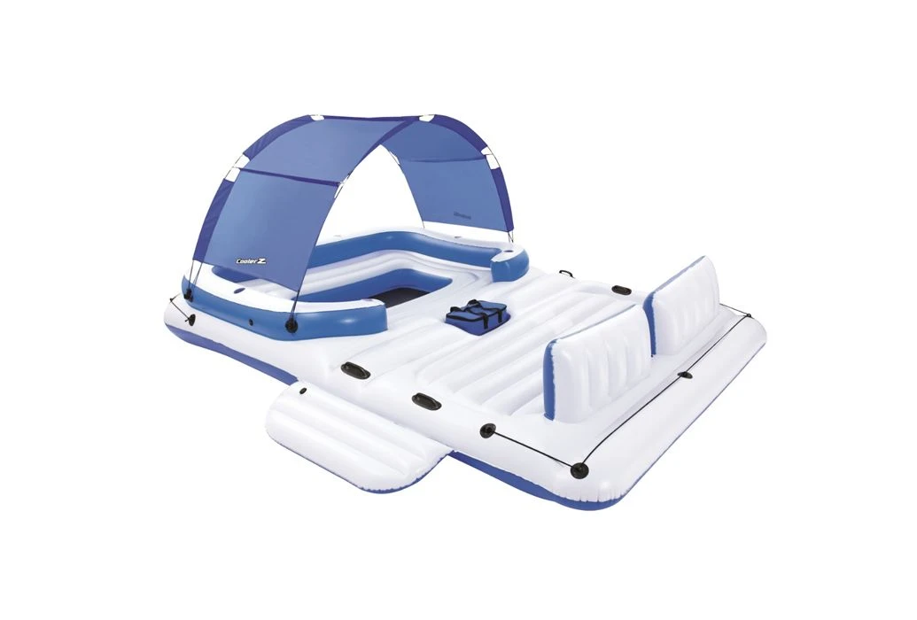 Dit superdeluxe eiland van Bestway is voorzien van een ingebouwde koelbox, een ruime zitbank en 2 stevige rugleuningen. Via de opblaasbare treeplank klim je eenvoudig op deze waterlounger. Inclusief afneembaar zonnescherm zodat je nog langer op het water kunt blijven.