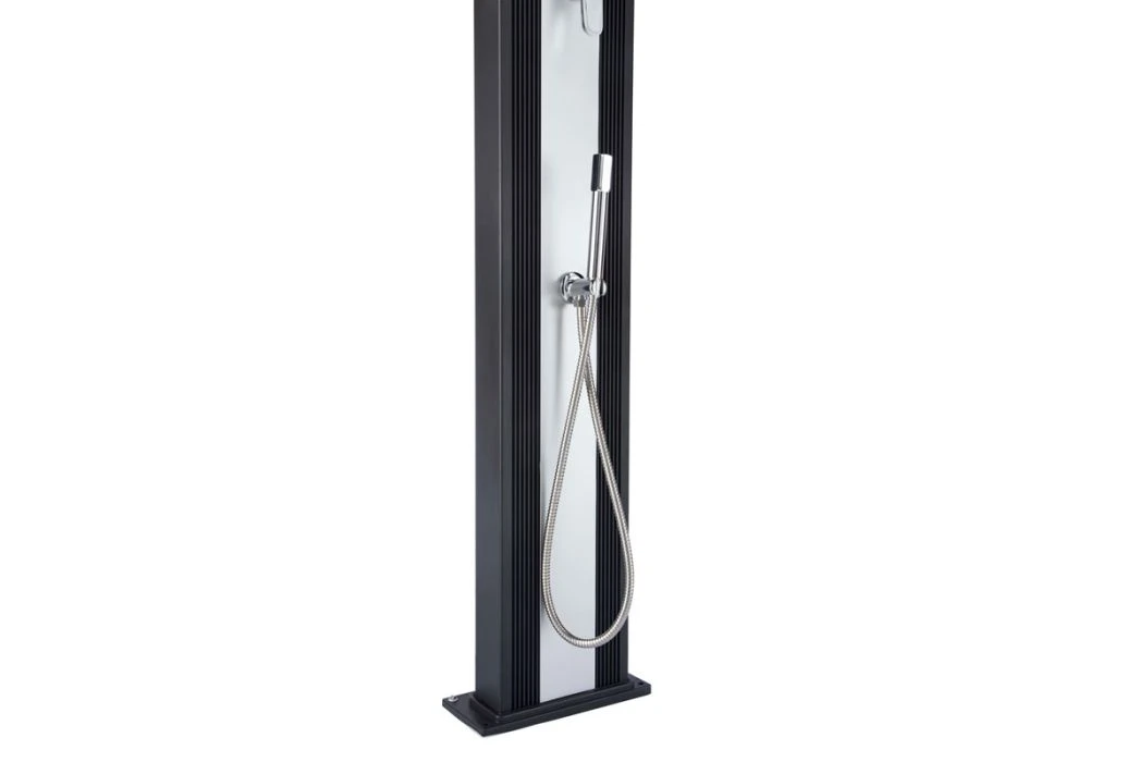 Daarnaast heeft de douche een warmwateraansluiting. Wanneer er niet genoeg zon is om je water op te warmen zou je hiermee warm water uit het huis kunnen aanvoeren naar de douche. Hierdoor krijg je nooit een koude douche.