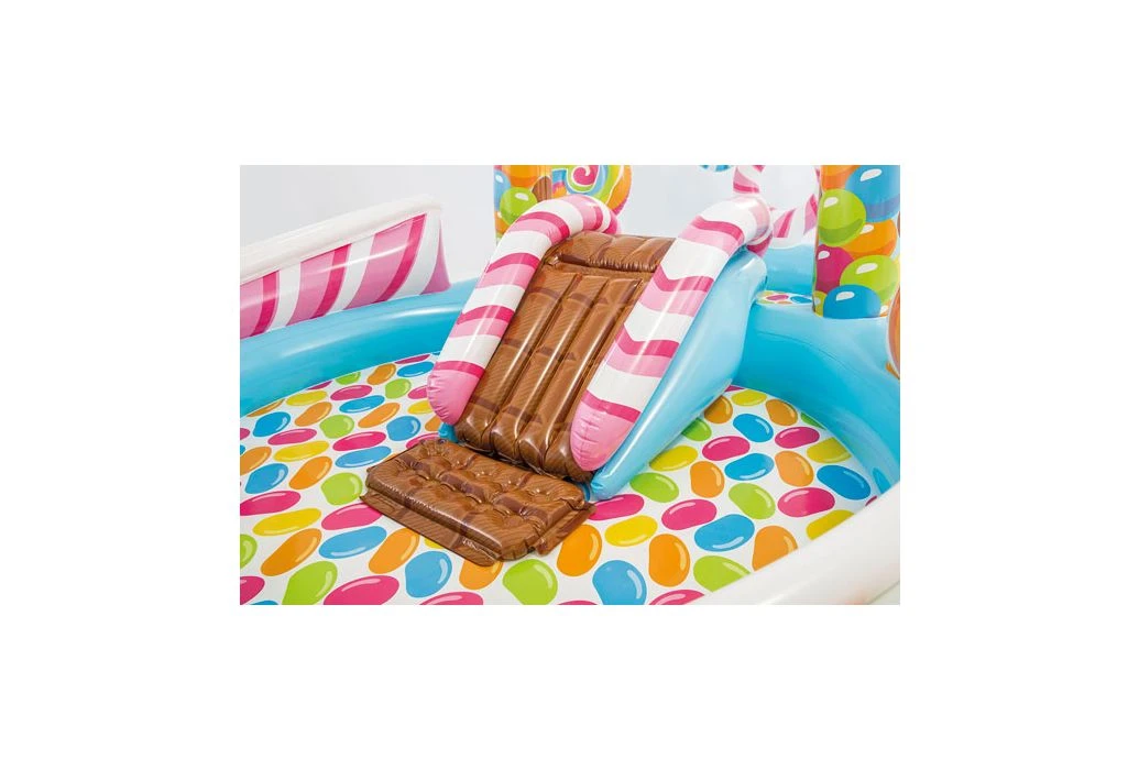 Urenlang speelplezier met dit Candy Zone speelbad van Intex! Het zwembadje is 2,95 x 1,91 x 1,30 meter groot en bestaat uit een groot en klein deel. Het grote deel heeft een capaciteit van 206L, en het kleine deel heeft een capaciteit van 168L.Â