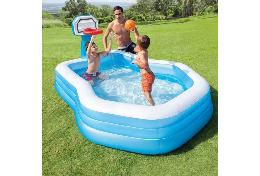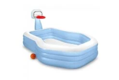 Het Shootin’ Hoops zwembad van Intex bestaat uit een opblaasbaar zwembad met op de rand een opblaasbare basket. Dit zwembad heeft een wandhoogte van 32 cm en kan gevuld worden met maximaal 682 liter water. Inclusief een afvoerstop, zodat je na gebruik gemakkelijk het water kan laten weglopen. Het opblaasbare zwembad is gemaakt van 0,33 mm dik vinyl en is goed bestand tegen basketballende kinderen.