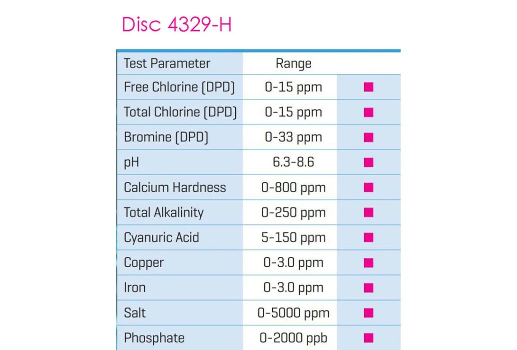 | testresultaat | Alkaliteit, Bromine, Calcium, Chloor (totaal), Chloor (vrij), Cyanuurzuur, Hardheid, Koper, pH, Zout |